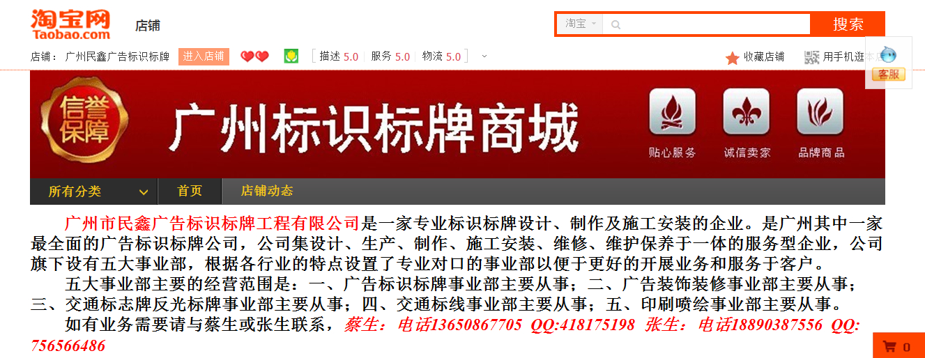 廣州市民鑫標(biāo)識(shí)標(biāo)牌工程公司淘寶店已開張,各位淘客如需零銷或網(wǎng)上訂購(gòu)標(biāo)識(shí)標(biāo)牌及業(yè)務(wù)咨詢的可直接通過本公司官方網(wǎng)站直接進(jìn)入。